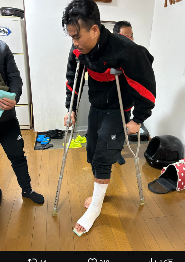松葉杖で会場を後にするデンサヤーム(@MisaKokubo)