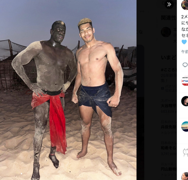 1日の投稿、2m130kgのセネガル相撲選手とのツーショット(@kingedoporoより)