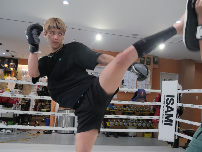 公開練習で蹴りを放つ白鳥(C)RISE