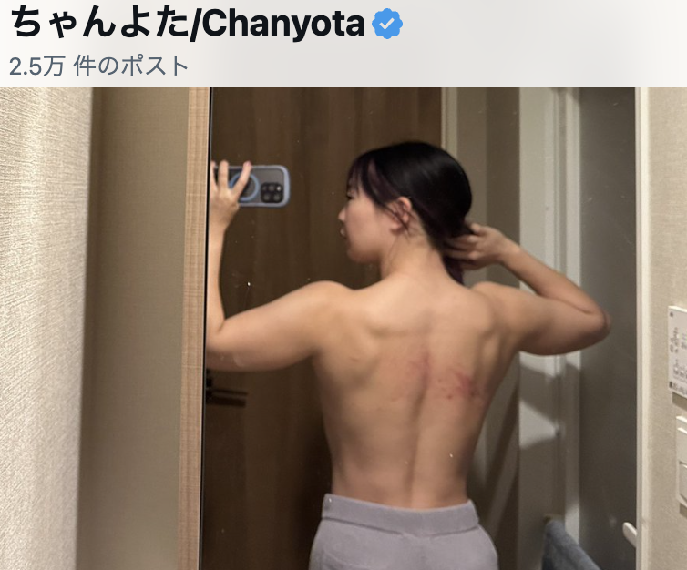 ちゃんよたが浴室前で見せた赤く腫れた背中(ちゃんよたのXより)