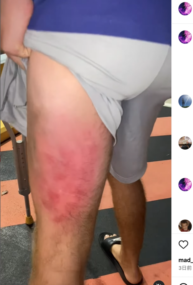 蹴られた太腿は悲惨な状態に@thejensendeanより