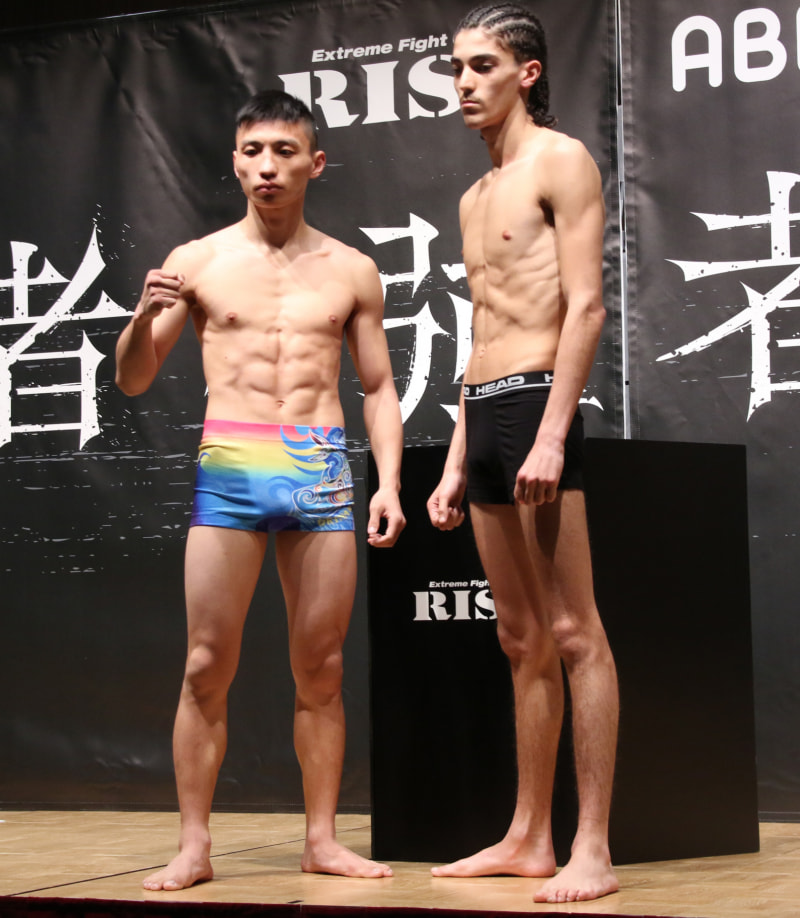 王者・大﨑(左)と、長身で手足の長い挑戦者キャルービー
