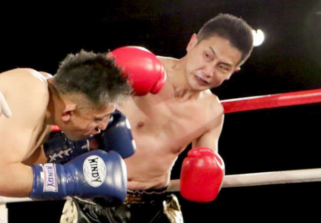 ロープ際で激しく打ち合ういっぱち(左)と木本(右)