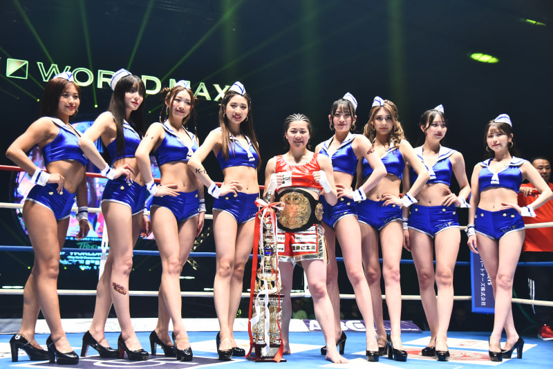 8人のK-1ラウンドガール2023が最後のリングに。中央は女子戦で勝利したSAHO