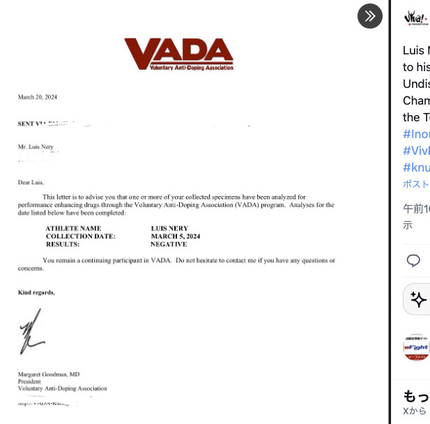 VADAのドーピング陰性証明書( VIVA PROMOTIONのXより)