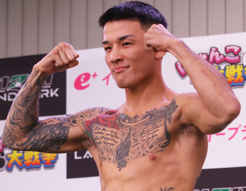 萩原がマッスルポーズで計量パス!