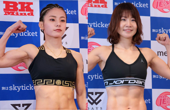 ケイト(左)と桐生(右)が共に割れた腹筋で計量パス!