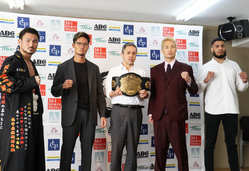 初代ミドル級(-75kg)王座のベルトをかけて4選手が争う(左から(左から神保、YOHAN、宮田P、谷川、ブハリ)