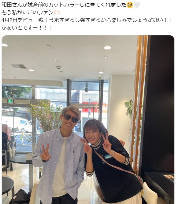 試合直前の女子ボクサー和田まどか(左)も来店(@miyuu11224028より)