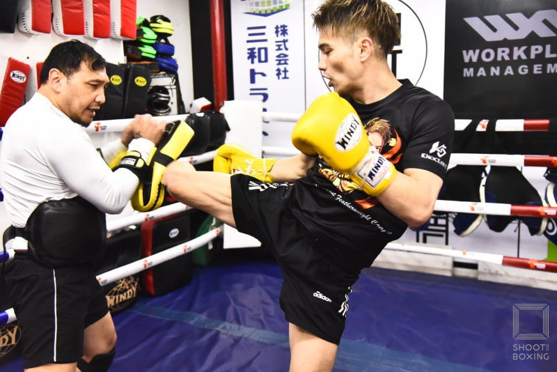 右ミドルを放つ栗秋©︎SHOOT BOXING