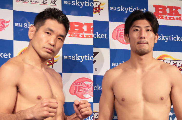 メインで対戦する佐藤洋一郎(左)と嶋田伊吹が計量パス