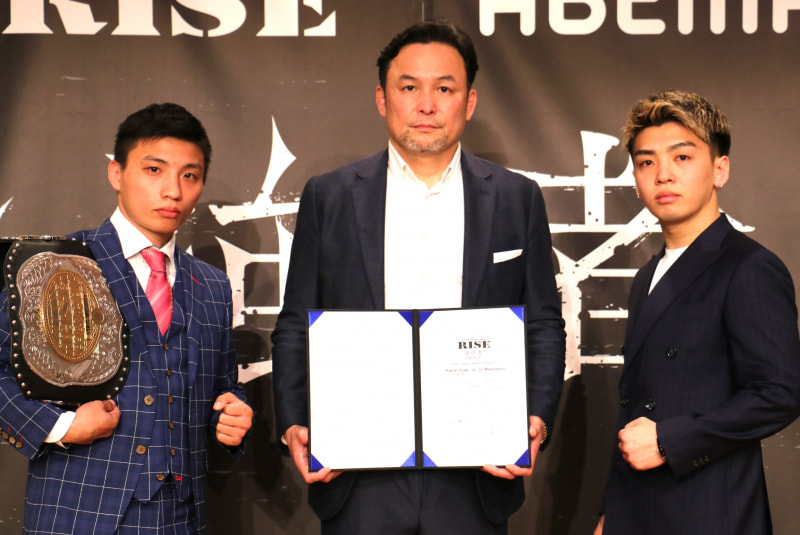 本日スーパーフライ級タイトルマッチ調印式を行った、王者・大﨑一貴(左)と政所仁(右)