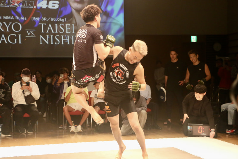 井上の飛びヒザに西谷が右を合わす!