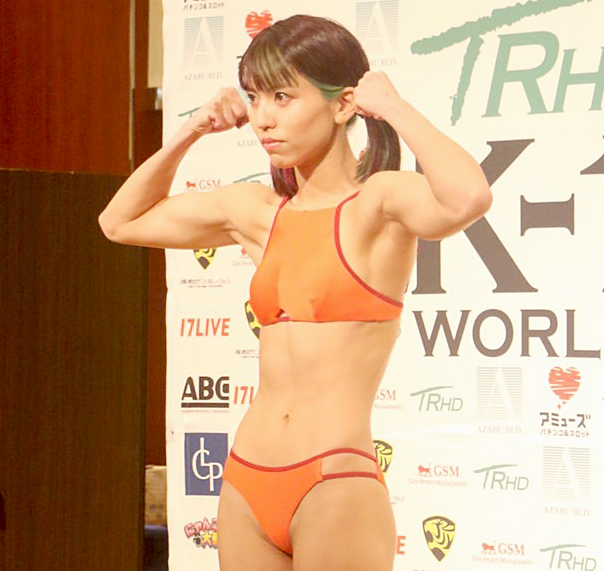 (今年3月のK-1の計量)オレンジ水着でマッスルポーズを決めるぱんちゃん