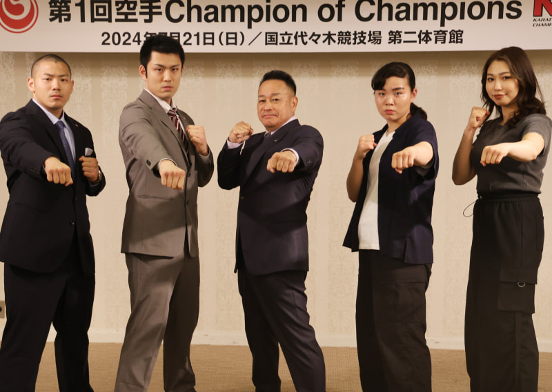 第1回『空手Champion of Champions』(KCC)の発表会見にて。 中央は緑健児代表、選手は左から渡辺優作、岡田侑己、鈴木未紘、網川来夢