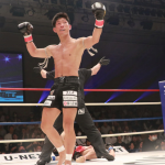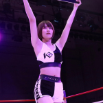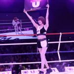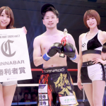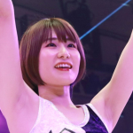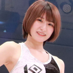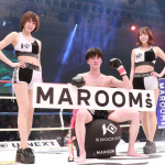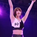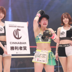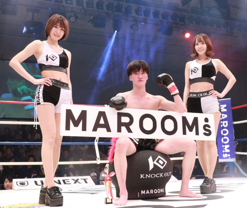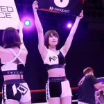 ラウンドガール来栖うさこ(左)、弓川いち華(右)、中央は利根川仁