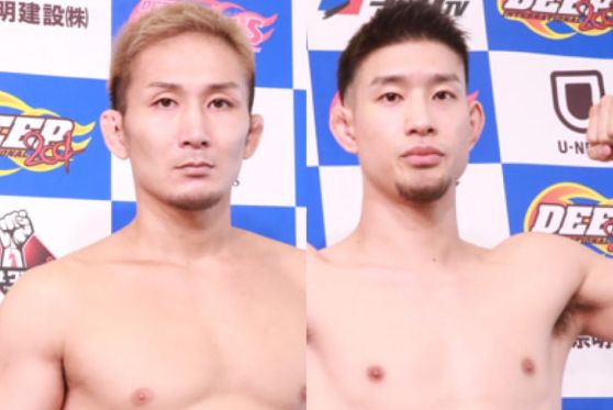 元谷(左)は計量パスして割れた腹筋を見せた。平松(右)も鍛えたボディを披露