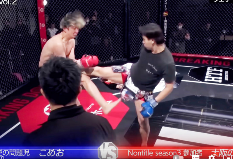 こめおが前蹴りで距離をとる(朝倉未来YouTubeより)
