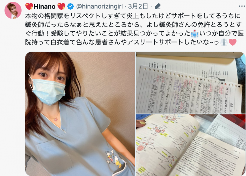 今年3月、鍼灸師を目指す事を報告したHinano(@hinanorizingirlより)