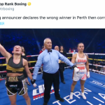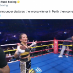 最初のコールで勝利者となり、喜ぶヒューズ@trboxingより