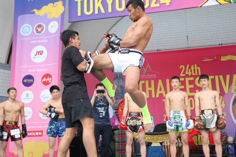 3、ミットに食い込む飛びヒザ蹴り