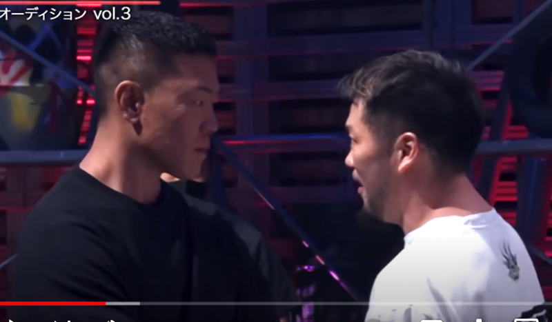 ヒロ三河(右)は生田(左)と睨み合う(『朝倉未来』YouTubeチャンネル)