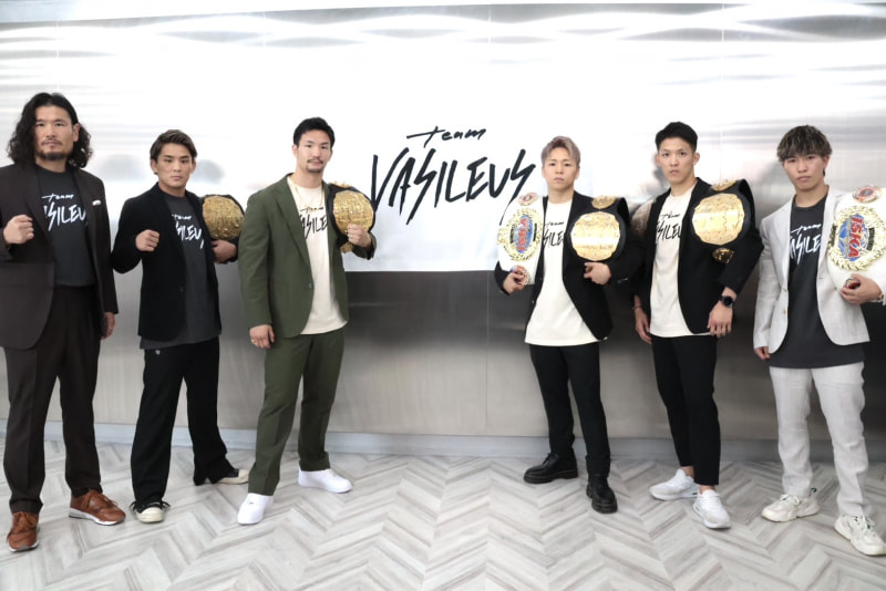 武尊(右から3番目)、松倉信太郎(左から3番目)が所属する『team VASILEUS』に新メンバー、寺田匠(右)、野杁正明(右から2番目)、与座優貴(左から2番目)