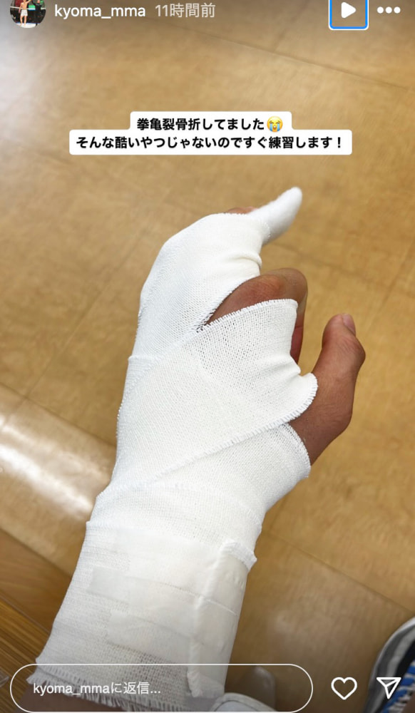 秋元が左拳の亀裂骨折を報告した(@kyoma_mmaより)