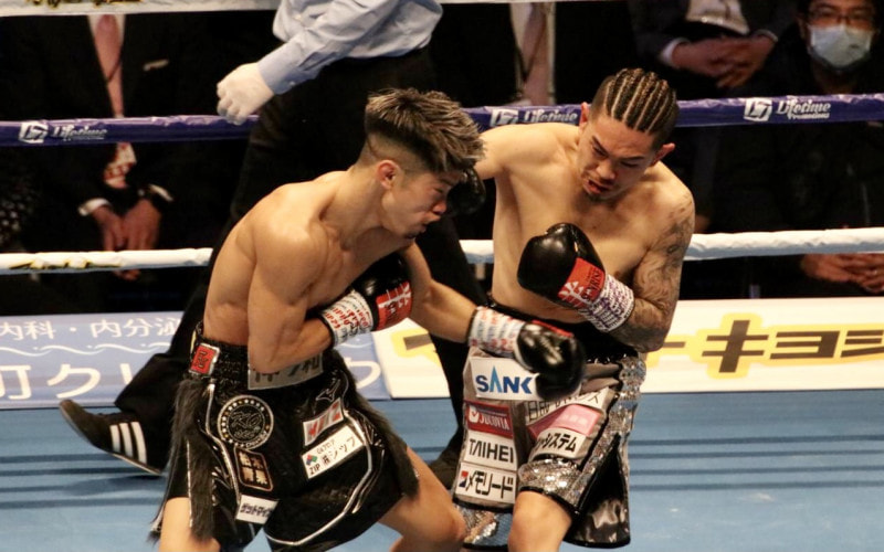 ガラあきになった田中のテンプルに、井岡のパンチがクリーンヒット