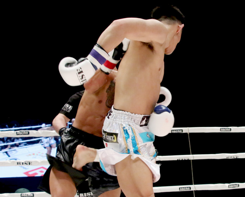 これが問題になったシーン。与座の後ろ蹴りが急所の周辺に