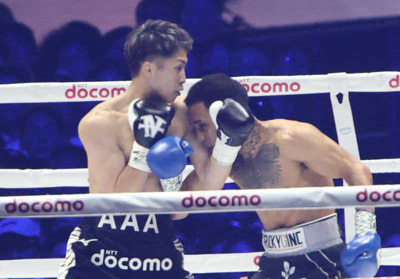 井上のアッパーにネリはすでに左フックのモーションに入る