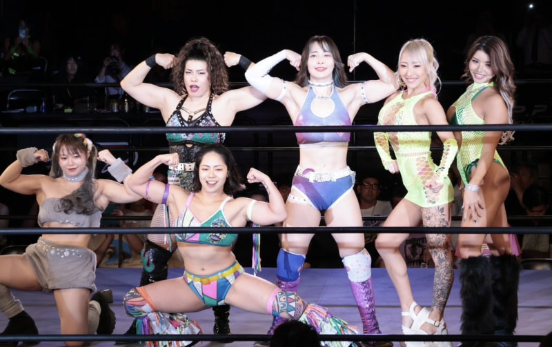 筋肉三姉妹がマッスルポーズ!(後列左から2番目がちゃんよた、後列左がZONES、前列右が小林香萌)