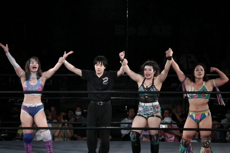勝利を喜ぶちゃんよた(左)、ZONES(右から2番目)、小林香萌(右)の筋肉三姉妹