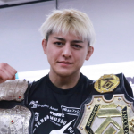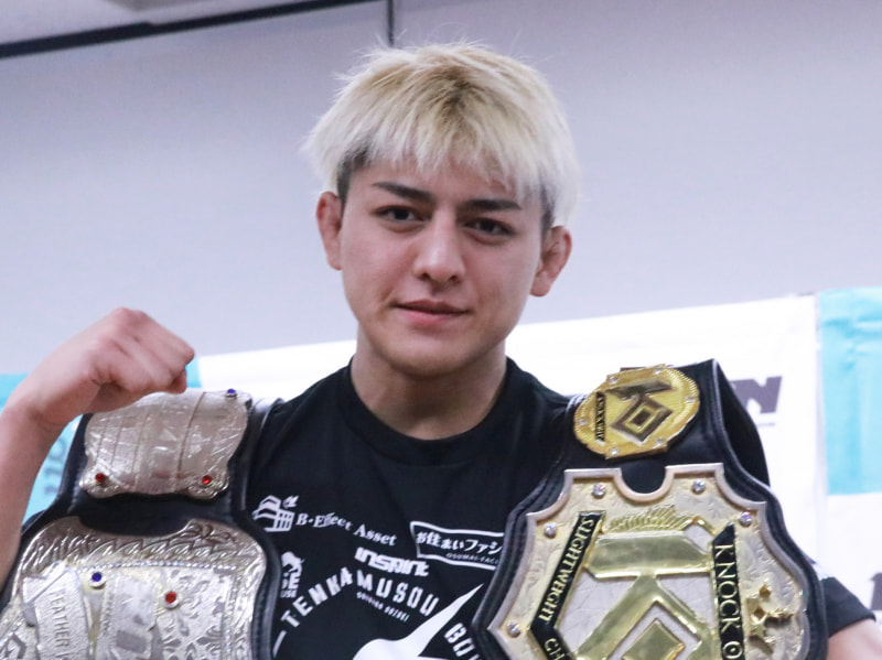 RIZINとKNOCKOUTのベルトを肩にさげる鈴木千裕