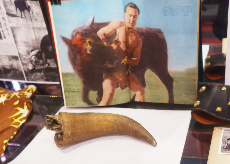 格闘技・プロレス関連の書籍やグッズなどを扱う「闘道館」が23年に大山倍達生誕100年記念として展示した、大山総裁が戦った牛の角