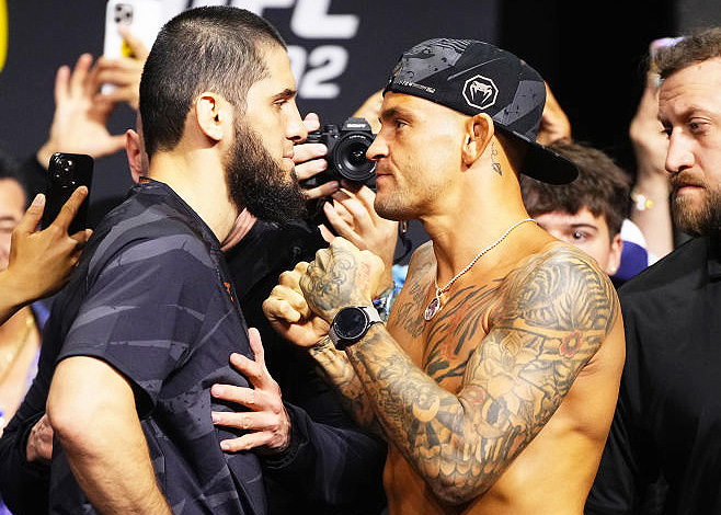 王者マカチェフ(左)と挑戦者ポイエー(右)、フェイスオフでバチバチの睨み合い!©️UFC