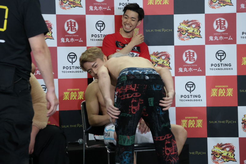 YUSHIがイスに座っても、額を付け合わせるジョリー