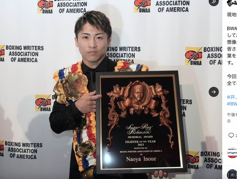 井上が全米ボクシング記者協会(BWAA)の授賞式に出席し、23年の年間最優秀選手賞(井上尚弥Xより)