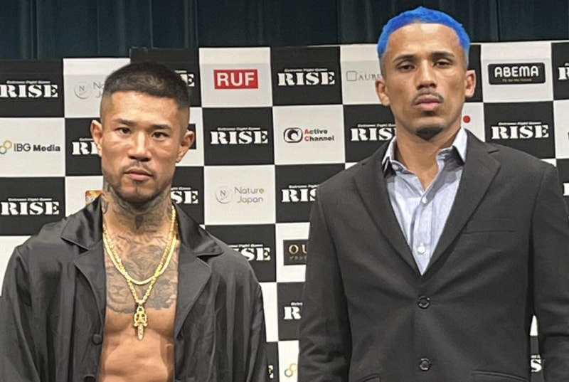 計量パスした中村(左)とタリソン、中村は腹筋チラ見せして会見に登場した