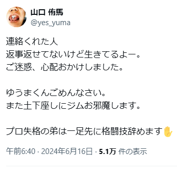 山口侑馬が自身のXでメッセージ(@yes_yumaより)