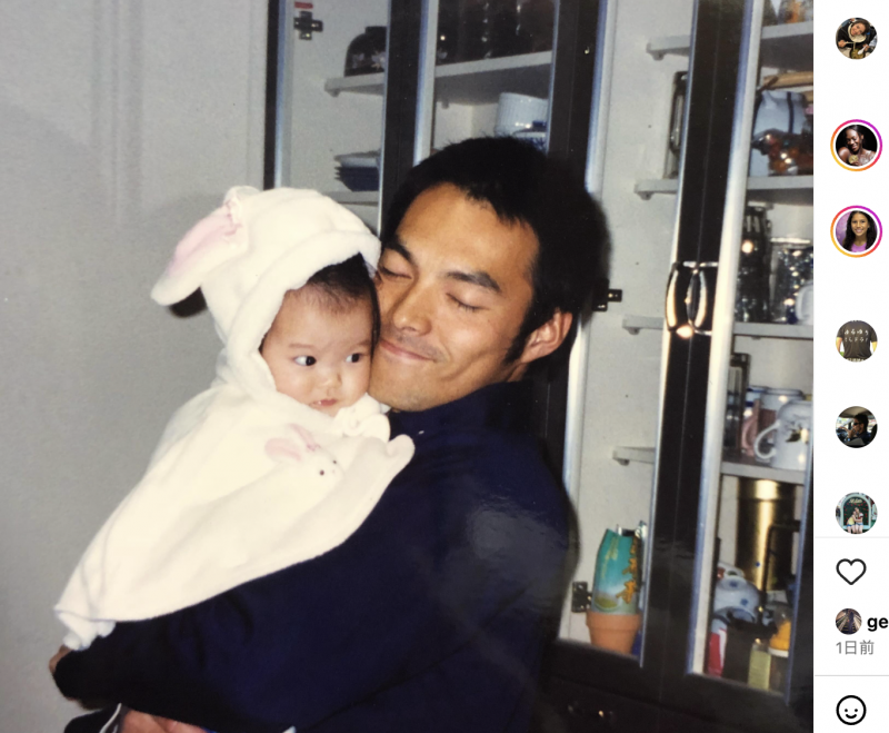 赤ちゃんの阿部詩と父の姿。「お父さんにそっくり」「ブルースリーみたい」との声が飛んだ。(阿部詩インスタより)