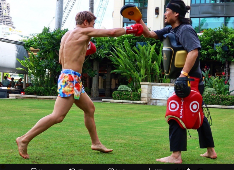 米合宿へ行く直前、タイでのミット打ち。筋肉の隆起がすごい(@takerusegawa)