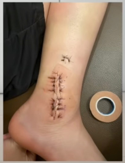 術後の縫い合わせた足(伊澤星花のYouTubeより)