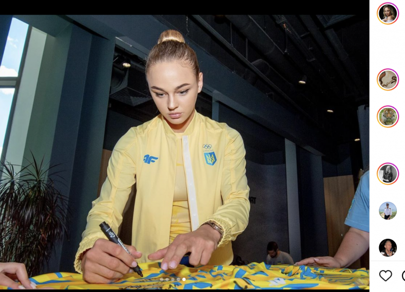 新ウクライナ五輪ウェア。国旗に決意のサインを書く(ビロディドのインスタより)