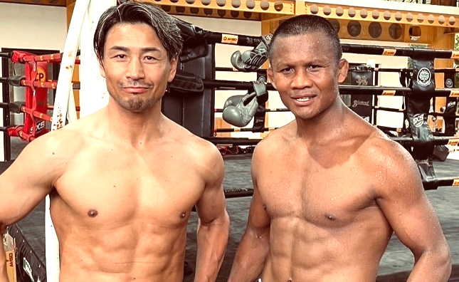 魔娑斗(左)とブアカーオ(右)がバキバキボディを披露した(@masato.official)