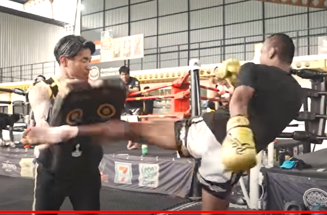 ブアカーオの強烈なミドルキックに魔裟斗が驚く(『魔裟斗』チャンネル)