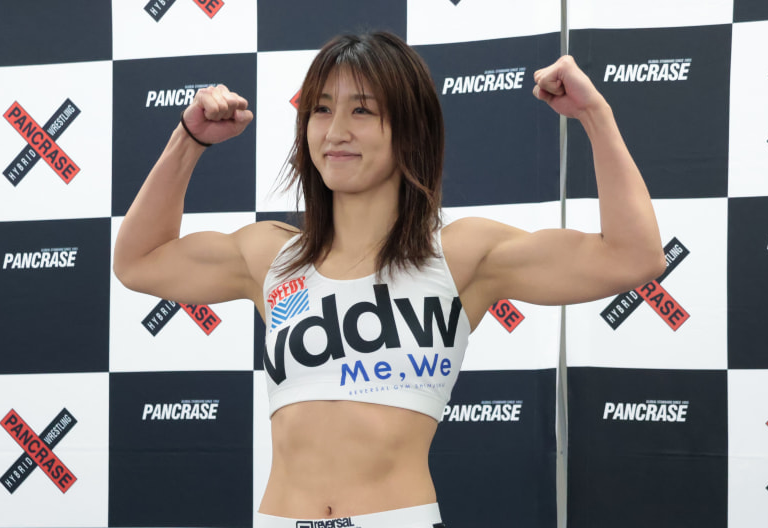 杉山しずか、計量パスでマッスルポーズ(今年3月)