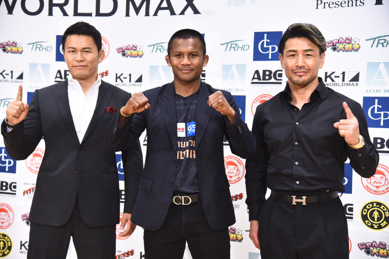 ブアカーオ(中)優勝に期待を寄せた魔裟斗(右)と須藤元気(左)