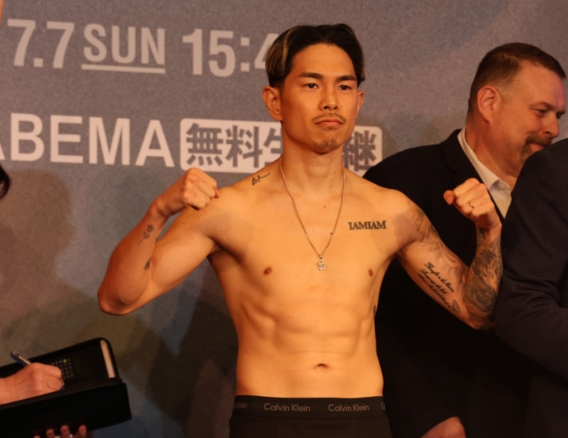 井岡が割れた腹筋で計量パス、マッスルポーズ