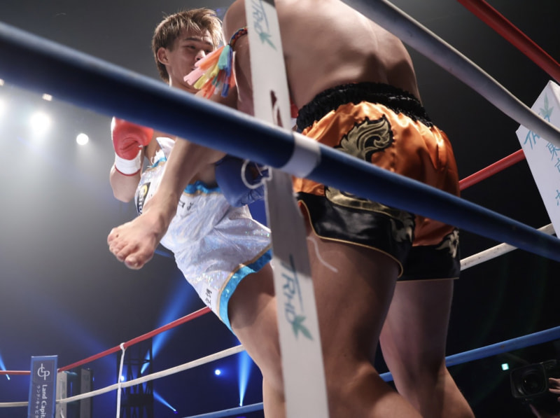 この飛びヒザ蹴りから強烈な左を当てる与座